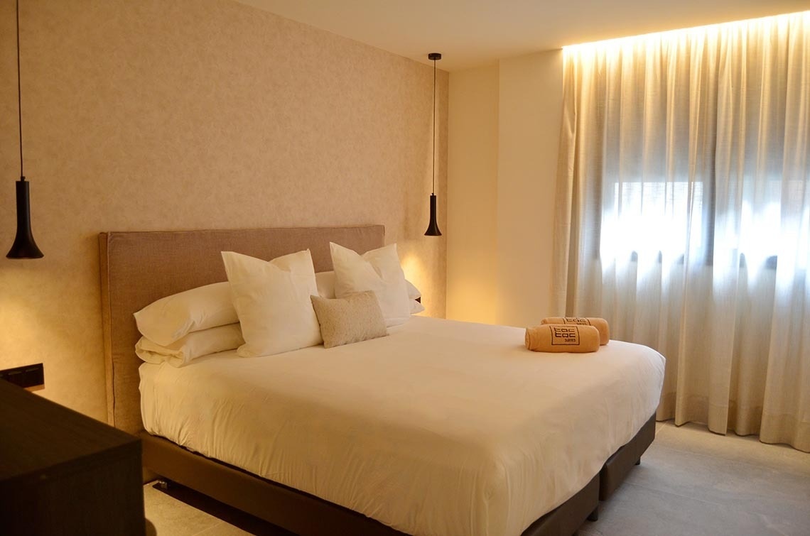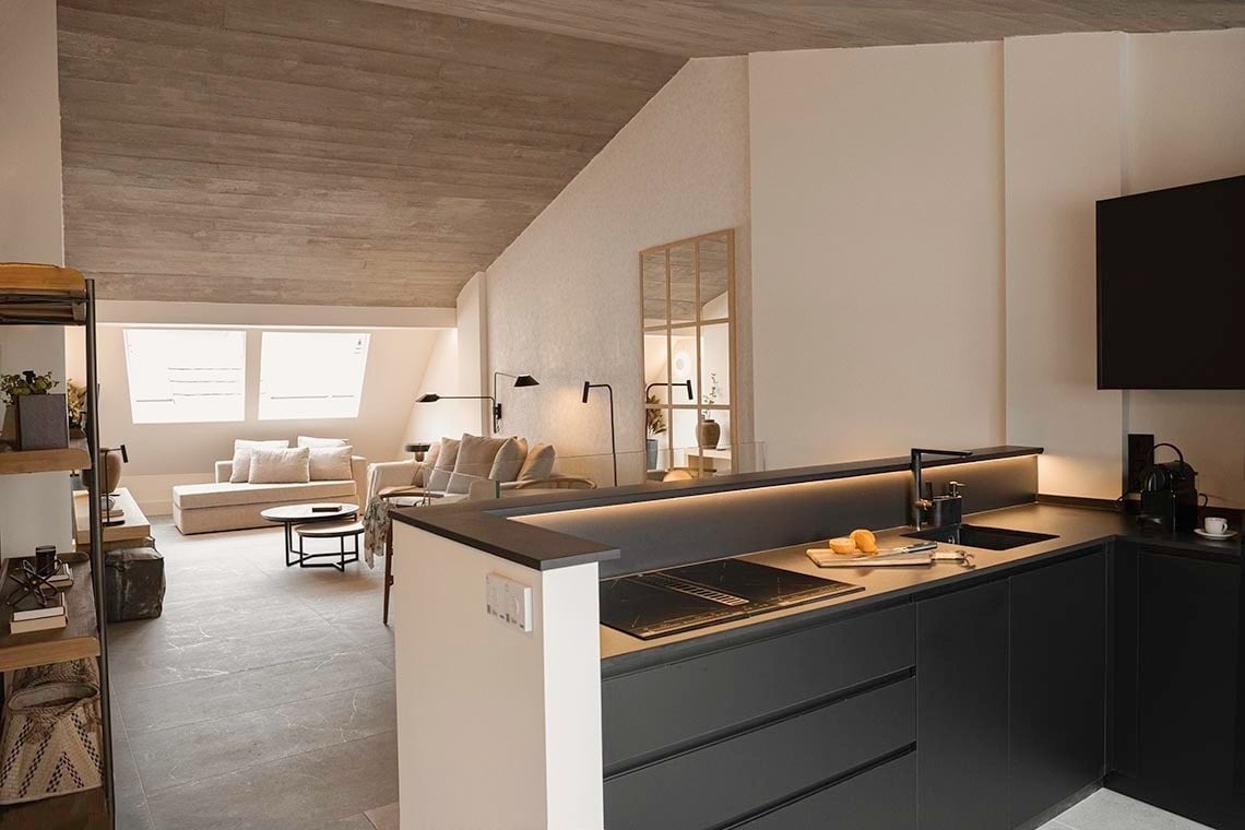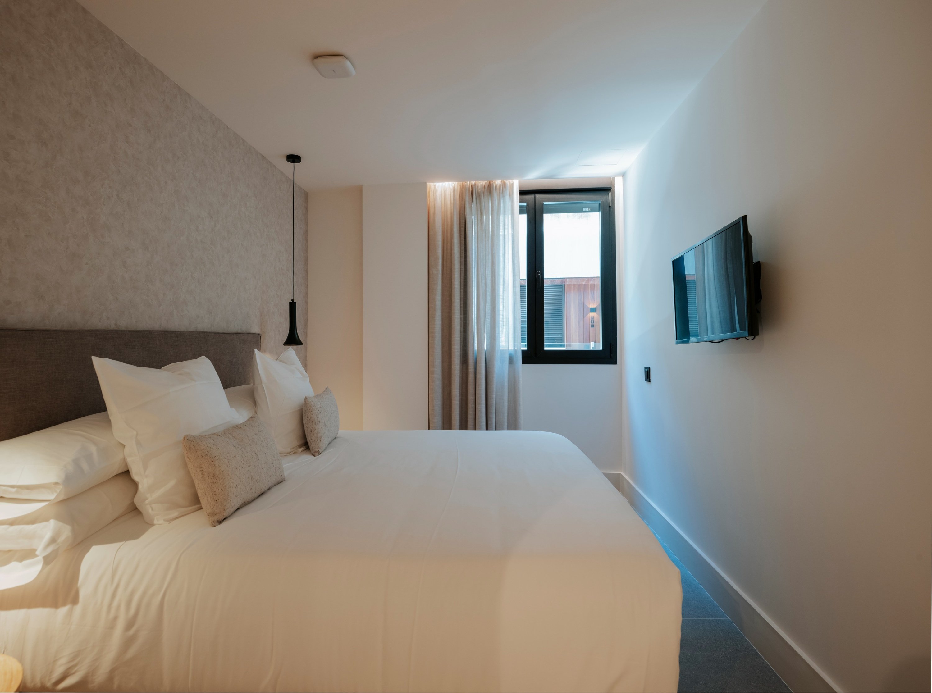 Estos dúplex de 107 m² están pensados para hospedar hasta 4 huéspedes con la máxima comodidad, sintiéndote como en casa. La planta baja cuenta con dos dormitorios con cama de matrimonio, dos baños independientes y vista exterior (algunos con balcón). En la planta alta encontrarás la cocina vista y el salón comedor con amplios ventanales en el tejado abuhardillado.