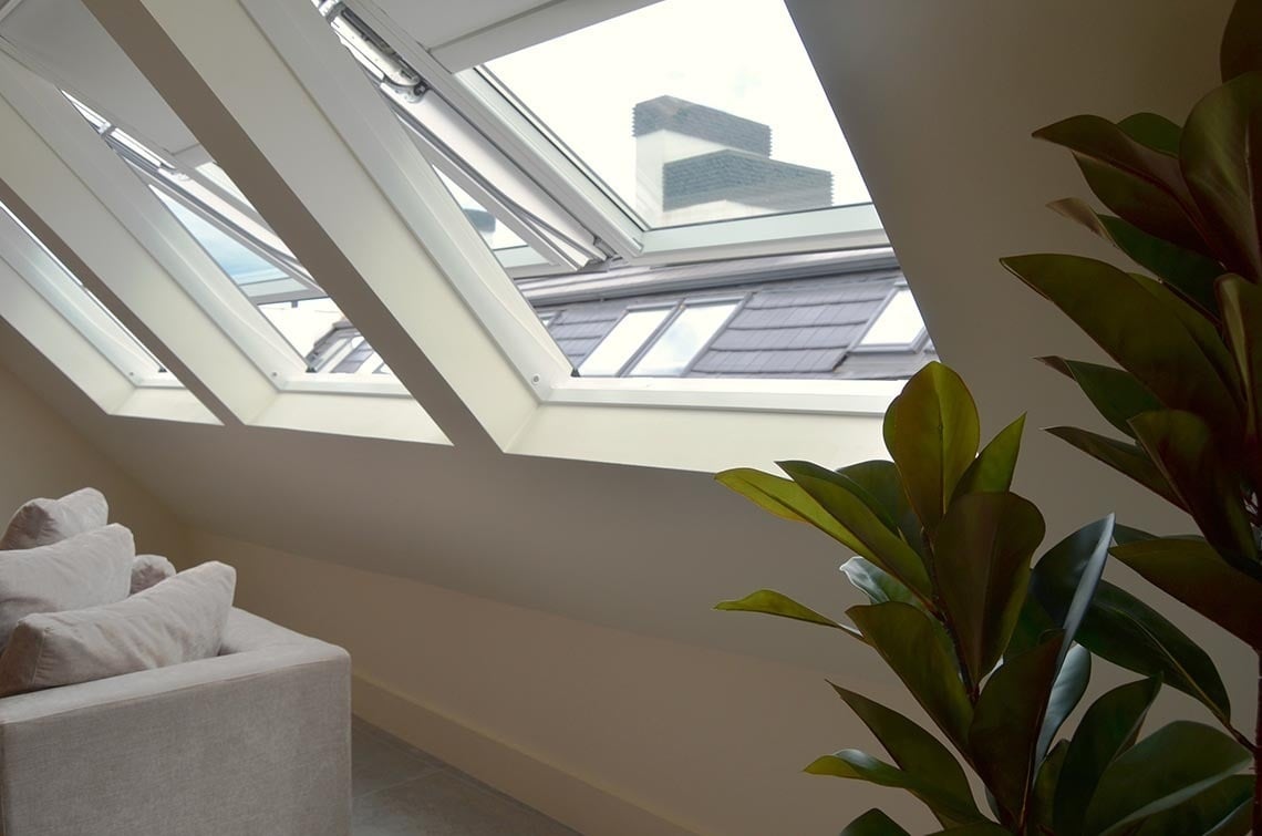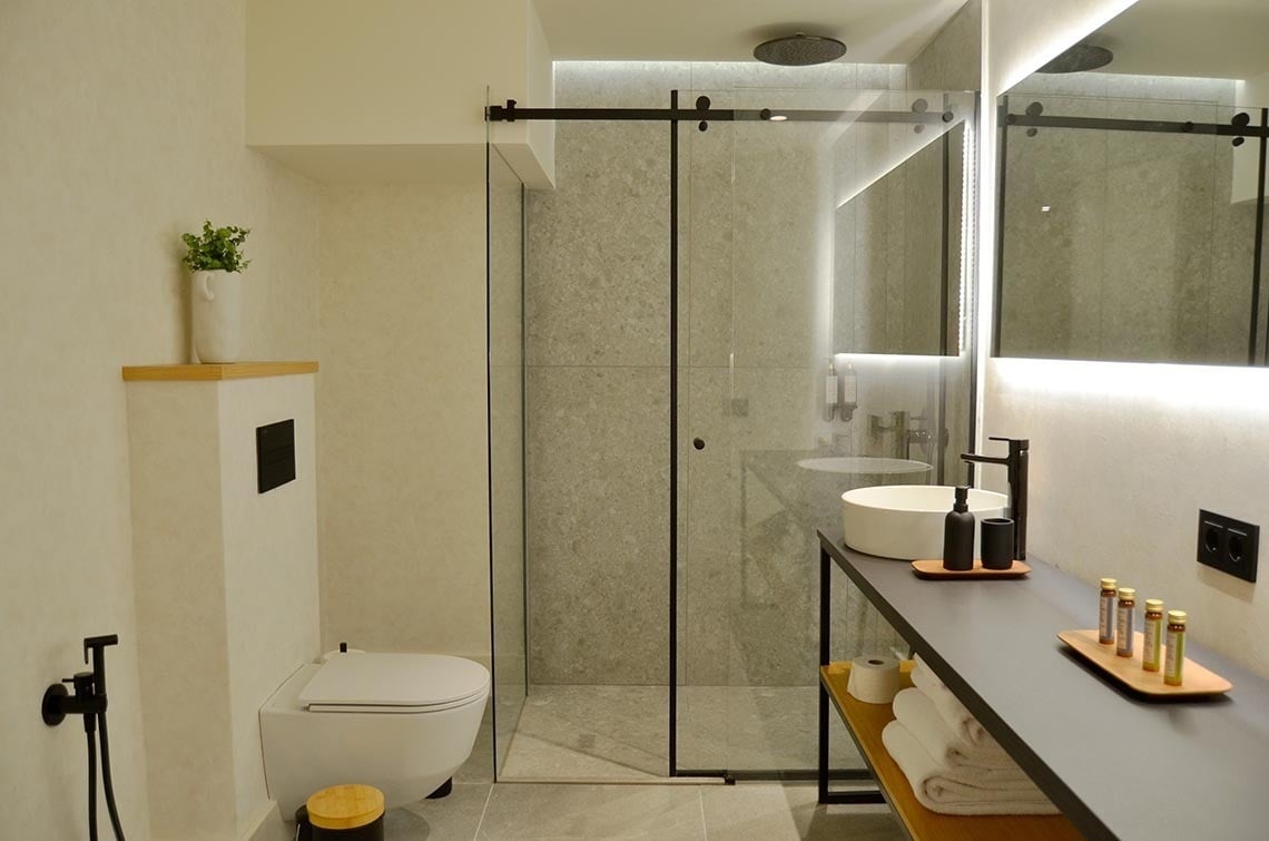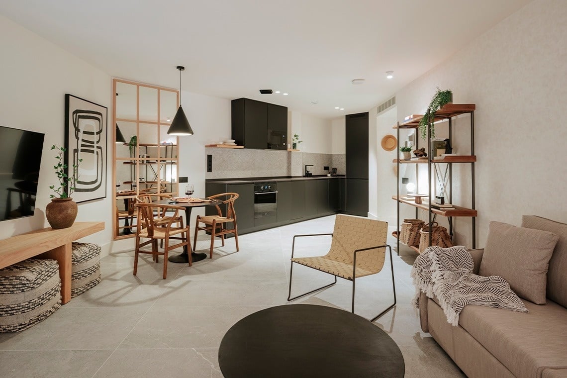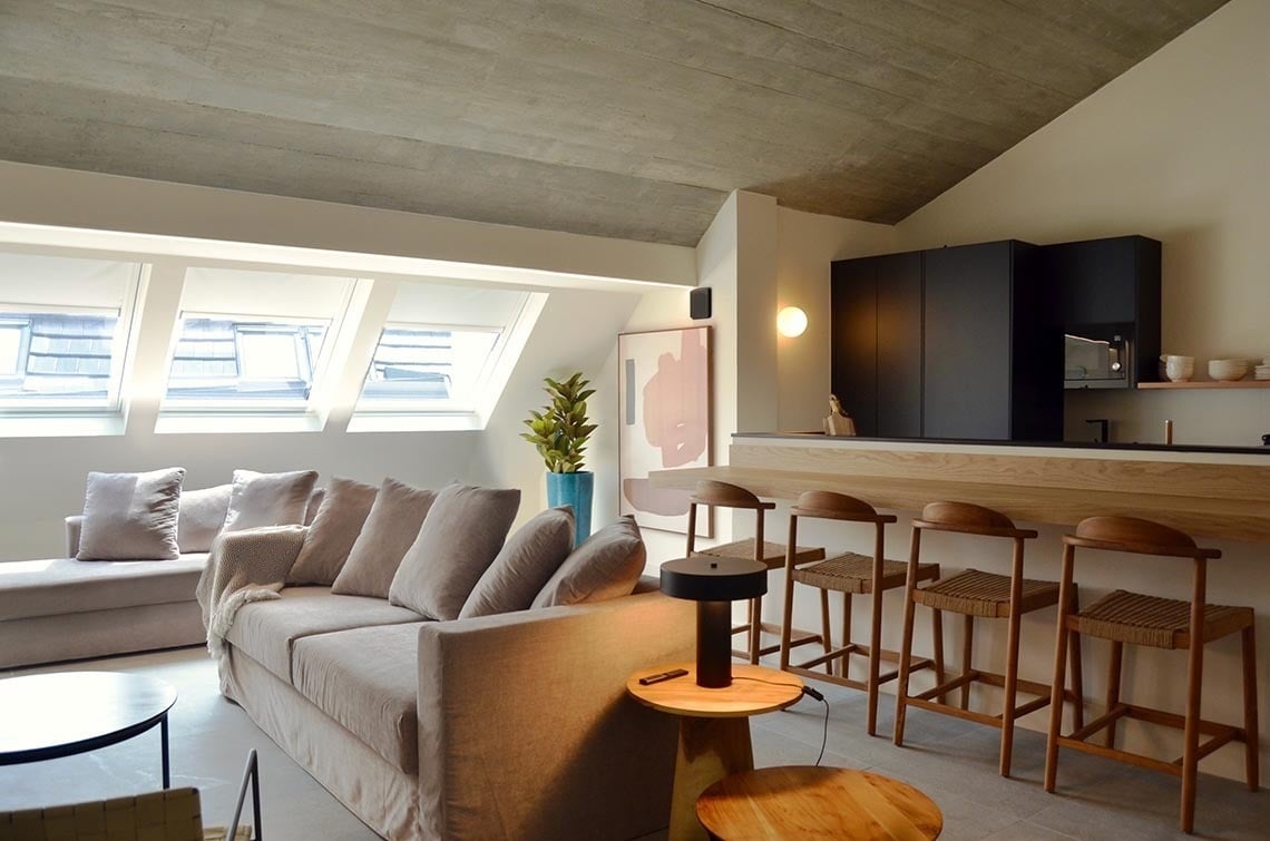 Estos dúplex de 107 m² están pensados para hospedar hasta 4 huéspedes con la máxima comodidad, sintiéndote como en casa. La planta baja cuenta con dos dormitorios con cama de matrimonio, dos baños independientes y vista exterior (algunos con balcón). En la planta alta encontrarás la cocina vista y el salón comedor con amplios ventanales en el tejado abuhardillado.
